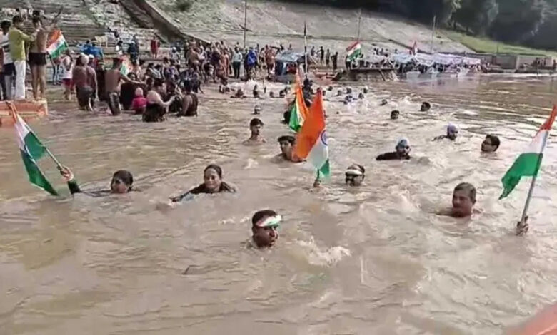 अखंड भारत तिरंगा यात्रा: उफनती नर्मदा नदी में 10 किमी तक यात्रा में बच्चे युवा और बुजुर्ग हुए शामिल