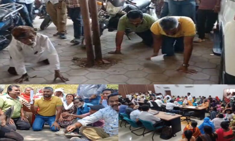 खंडवा में अनोखा विरोध-प्रदर्शन: घुटनों के बल और लेटकर कलेक्ट्रेट पहुंचे लोग