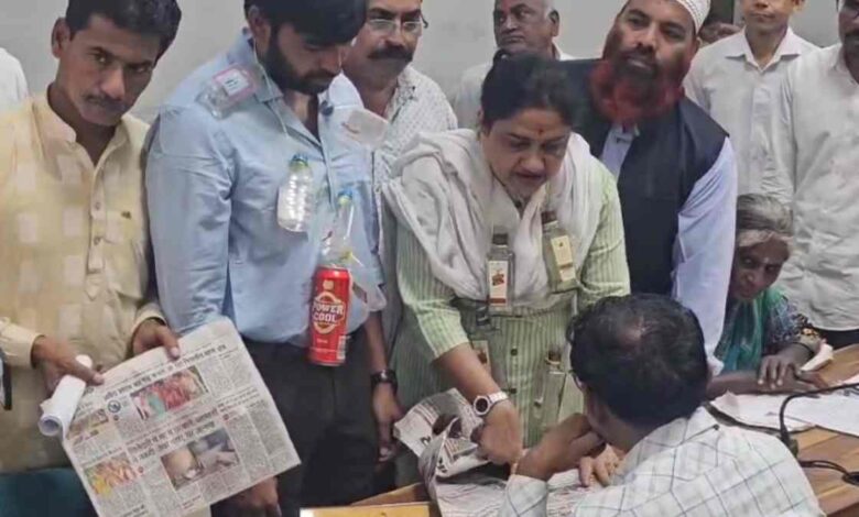 खंडवा में कांग्रेस का अनोखा प्रदर्शन: शराब की बोतल की माला गले में डालकर जनसुनवाई में पहुंचे