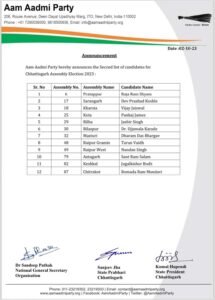 आम आदमी पार्टी के विधानसभा प्रत्याशियों के दूसरी लिस्ट में कुल 12 नाम शामिल हैं. जिसमें प्रतापपुर से राजाराम श्याम, सारंगढ़ से देव प्रसाद कोशले, खरसिया से विजय जायसवाल, कोटा से पंकज जेम्स, बिल्हा से जसवीर सिंह, बिलासपुर से डॉ. उज्जवला कराडे, मस्तूरी से धर्मदास भार्गव, रायपुर ग्रामीण से तरुण वैध, रायपुर पश्चिम से नंदन सिंह, अंतागढ़ से संतराम सलाम केशकाल से जुगल किशोर दिशा और चित्रकूट से बोमाडा राम मांडवी को आम आदमी पार्टी ने अपना उम्मीदवार घोषित किया है.