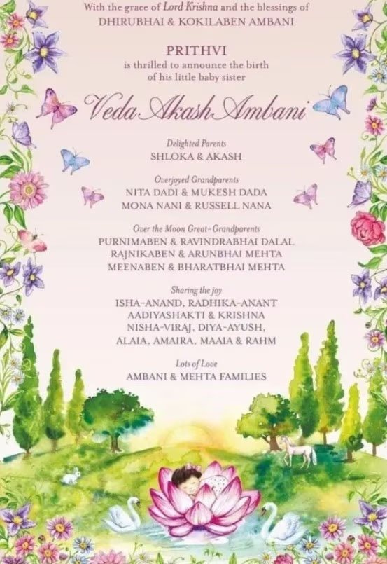 वेद संस्कृत में एक लड़की का नाम है जिसका अर्थ है ज्ञान या ज्ञान और हिंदू धर्म के अनुयायियों के बीच लोकप्रिय है. वेद प्रारंभिक भारतीय शास्त्रों के पवित्र लिखित ग्रंथ हैं जो धर्म का आधार बनते हैं. वे संस्कृत साहित्य के सबसे पुराने रूपों में से हैं, जिनके बारे में माना जाता है कि वे प्राचीन विद्वानों द्वारा लिखे गए थे. वेद नाम का मतलब पवित्र ज्ञान, धन, कीमती, चार दार्शनिक ग्रंथों अंतर्निहित हिंदू धर्म होता है.कार्ड में लिखा है- ”भगवान श्रीकृष्ण ओर धीरुभाई अंबानी और कोकिलाबेन अंबानी के आशीर्वाद से पृथ्वी अपनी छोटी बहन वेदा आकाश अंबानी की जन्म की घोषणा करता है.” इस कार्ड में अंबानी और मेहता परिवार के सदस्यों का नाम है.
