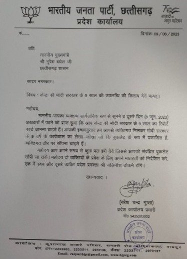 रायपुर : बीजेपी ने मुख्यमंत्री भूपेश बघेल से मिलने के लिए वक़्त मांगा है। दरअसल बीजेपी केंद्र में मोदी सरकार के 9 साल के कार्यकाल पर आधारित एक बुकलेट प्रकाशित हुआ है। जिसे वह मुख्यमंत्री को भेट करना चाहते है। बीजेपी के प्रदेश कार्यालय प्रभारी नरेश गुप्ता ने मुख्यमंत्री को पत्र लिखकर अनुरोध किया है कि उन्हें मिलने का वक्त दिया जाये, ताकि वो उनसे मिलकर 9 साल तक की मोदी सरकार की उपलब्धियों की किताब को भेंट कर सकें। पत्र में नरेश गुप्ता ने लिखा है कि मुख्यमंत्री ने मोदी सरकार के 9 साल के रिपोर्ट कार्ड को जानना चाहा है। तोह उनकी उपलब्धियों को लेकर 9 साल के कार्यकाल का बुकलेट प्रकाशित हुआ है। जो मुख्यमंत्री को बीजेपी सौंपना चाहती है।