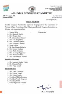 न्यूज़ डेस्क : छत्तीसगढ़ इस साल के अंत में विधानसभा चुनाव होने है। प्रमुख पार्टियों द्वारा चुनाव के लिए अपनी कमर कस ली है। एक दिन पूर्व ही बीजेपी ने 90 में से 21 विधानसभा सीटों के लिए उम्मीदवारों के नाम का ऐलान कर दिया। जिसके बाद आज छत्तीसगढ़ कांग्रेस पॉलिटिकल अफेयर कमेटी सूची जारी की गई। कांग्रेस पॉलिटिकल अफेयर कमेटी जारी सूची में कमेटी की अध्यक्ष प्रभारी कुमारी शैलजा को बनाया गया। वहीं कमेटी में CM भूपेश बघेल और TS सिंहदेव भी शामिल हैं। बता दें कि कमेटी के इस जारी सूची में दीपक बैज समेत 14 नेताओं को जगह मिली है।