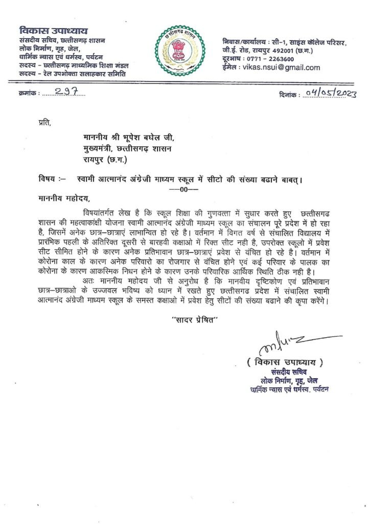 विधायक विकास उपाध्याय ने लिखा कि स्कूल शिक्षा की गुणवत्ता में सुधार करते हुए छत्तीसगढ़ शासन की महत्वकांक्षी योजना स्वामी आत्मानंद अंग्रेजी माध्यम स्कूल का संचालन पूरे प्रदेश में हो रहा है, जिसमें अनेक छात्र-छात्राएं लाभान्वित हो रहे हैं. वर्तमान में विगत् वर्ष से संचालित विद्यालय में प्रारंभिक पहली के अतिरिक्त दूसरी से बारहवीं कक्षाओं में रिक्त सीट नहीं है, उक्त सभी स्कूलों में प्रवेश सीट सीमिति होने के कारण अनेक प्रतिभावान छात्र-छात्राएं प्रवेश से वंचित हो रहे हैं. वर्तमान में कोरोना काल के कारण अनेक परिवारों का रोजगार से वंचित होने एवं कई परिवार के पालक का कोरोना के कारण आकस्मिक निधन होने के कारण उनके पारिवारिक आर्थिक स्थिति ठीक नहीं हैं. विधायक विकास उपाध्याय ने मुख्यमंत्री जी से प्रतिभावान छात्र-छात्राओं के उज्जवल भविष्य को ध्यान में रखते हुए छत्तीसगढ़ प्रदेश में संचालित स्वामी आत्मानंद अंग्रेजी माध्यम स्कूल के समस्त कक्षाओं में प्रवेश हेतु सीटों की संख्या में वृद्धि करने हेतु अनुरोध किया है.