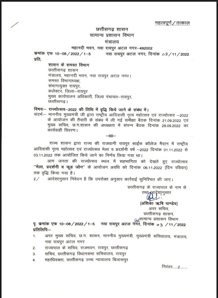 रायपुर. मुख्यमंत्री भूपेश बघेल ने आज शाम राष्ट्रीय आदिवासी नृत्य महोत्सव के समापन समारोह में लोगो की मांग पर राज्योत्सव में लगाई विभागीय प्रदर्शनी, मेला और फूड जोन को आगामी 6 नवम्बर तक बढ़ाया.