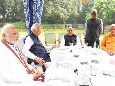 बीजेपी के वरिष्ठ नेता लालकृष्ण आडवाणी का 95वां जन्मदिन है. इस खास मौके पर प्रधानमंत्री नरेंद्र मोदी लालकृष्ण आडवाणी को उनके 95वें जन्मदिन की बधाई देने उनके घर पहुंचे. पीएम मोदी के साथ रक्षा मंत्री राजनाथ सिंह भी मौजूद थे. पीएम मोदी आडवाणी की बेटी प्रतिभा आडवाणी के साथ लॉन में पहुंचे और बातचीत के लिए बैठने से पहले आडवाणी को एक गुलदस्ता भेंद किया. पीएम मोदी के अलावा पार्टी के अन्य नेताओं ने भी आडवाणी को जन्मदिन के मौके पर बधाई दी.