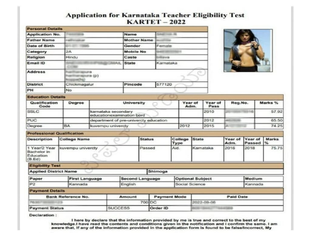 एडमिट कार्ड का स्क्रीन ग्रैब सोशल मीडिया पर शेयर किया गया और राज्य शिक्षा प्रशासन ने जांच शुरू कर दी. कर्नाटक कांग्रेस के सोशल मीडिया चेयरपर्सन बीआर नायडू ने मंगलवार को कहा कि राज्य के शिक्षा विभाग ने उम्मीदवार के बजाय हॉल टिकट पर पूर्व एडल्ट स्टार की तस्वीर छापी है.